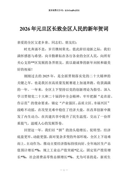 / 【七哥公文】2026年:2026年元旦区长致全区人民的新年贺词+更多免费公文+VX:QiGeGongWen2024
