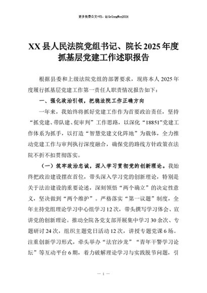【七哥公文】2026年:XX县人民法院党组书记、院长2025年度抓基层党建工作述职报告+更多免费公文+VX:QiGeGongWen2024
