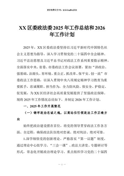 【七哥公文】2026年:XX区委政法委2025年工作总结和2026年工作计划+更多免费公文+VX:QiGeGongWen2024