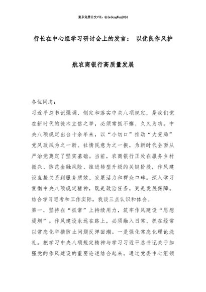 【七哥公文】2026年:行长在中心组学习研讨会上的发言: 以优良作风护航农商银行高质量发展_副本+更多免费公文+VX:QiGeGongWen2024