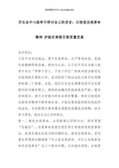 【七哥公文】2026年:行长在中心组学习研讨会上的发言:以彻底自我革命精神 护航农商银行高质量发展_副本+更多免费公文+VX:QiGeGongWen2024