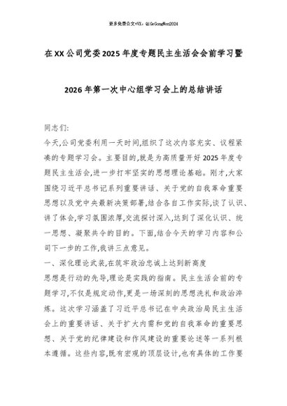 【七哥公文】2026年:在XX公司党委2025年度专题民主生活会会前学习暨2026年第一次中心组学习会上的总结讲话_副本+更多免费公文+VX:QiGeGongWen2024