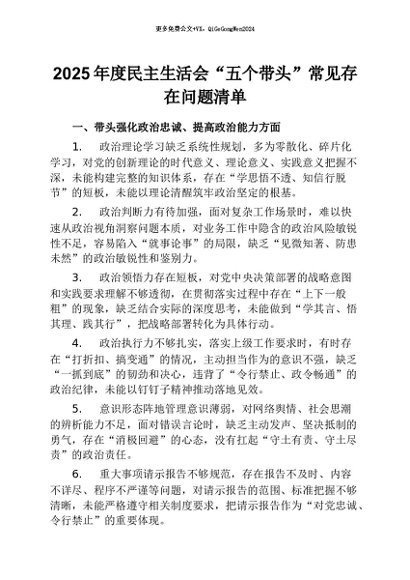 【七哥公文】2026年:2025年度民主生活会“五个带头”常见存在问题清单(5)+更多免费公文+VX:QiGeGongWen2024