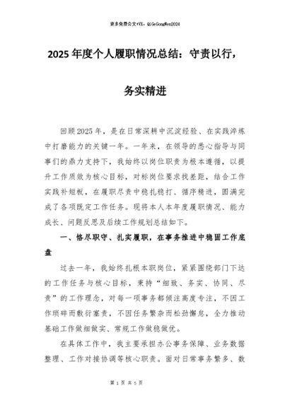 【七哥公文】2026年:2025年度个人履职情况总结:守责以行,务实精进+更多免费公文+VX:QiGeGongWen2024