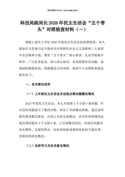 【七哥公文】2026年:科技局副局长2026年民主生活会“五个带头”对照检查材料(一)+更多免费公文+VX:QiGeGongWen2024