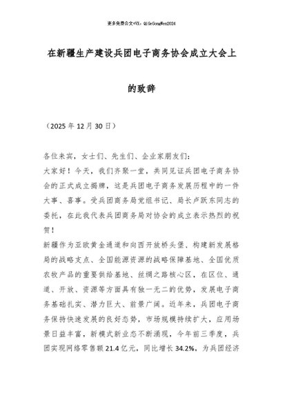 【七哥公文】2026年:在新疆生产建设兵团电子商务协会成立大会上的致辞_副本+更多免费公文+VX:QiGeGongWen2024