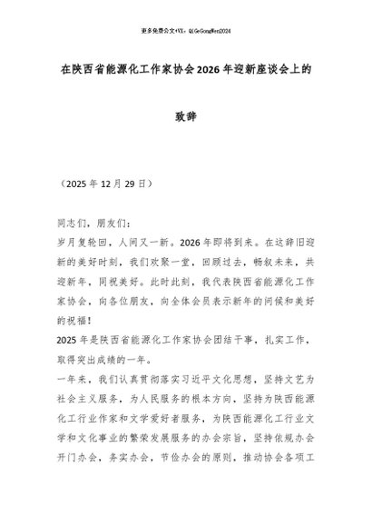 【七哥公文】2026年:在陕西省能源化工作家协会2026年迎新座谈会上的致辞_副本+更多免费公文+VX:QiGeGongWen2024