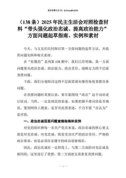【七哥公文】2026年:(138条)2025年民主生活会对照检查材料“带头强化政治忠诚、提高政治能力”方面问题起草指南、实例和素材_副本+更多免费公文+VX:QiGeGongWen2024