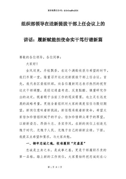 【七哥公文】2026年:组织部领导在送新提拔干部上任会议上的讲话:履新赋能担使命实干笃行谱新篇+更多免费公文+VX:QiGeGongWen2024