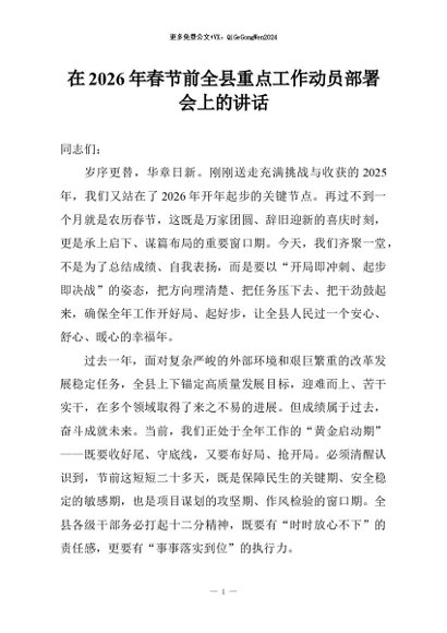 【七哥公文】2026年:在2026年春节前全县重点工作动员部署会上的讲话+更多免费公文+VX:QiGeGongWen2024