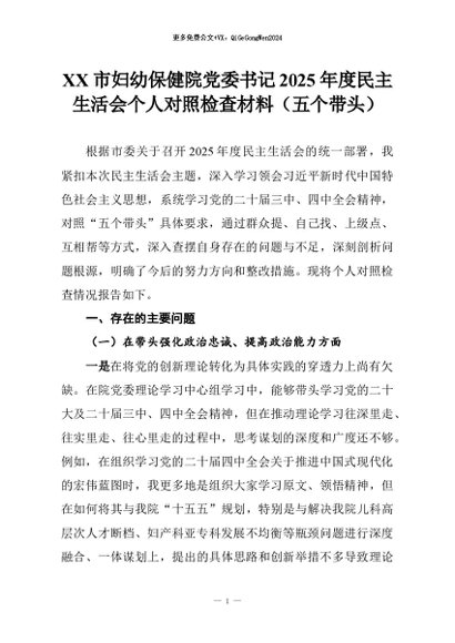 【七哥公文】2026年:XX市妇幼保健院党委书记2025年度民主生活会个人对照检查材料(五个带头)_副本+更多免费公文+VX:QiGeGongWen2024