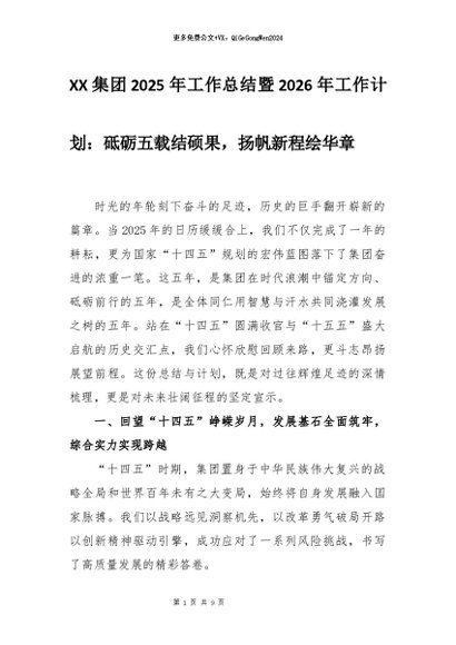 【七哥公文】2026年:XX集团2025年工作总结暨2026年工作计划:砥砺五载结硕果,扬帆新程绘华章+更多免费公文+VX:QiGeGongWen2024
