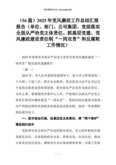 【七哥公文】2026年:(56篇)2025年党风廉政工作总结汇报报告(单位、部门、公司集团、党组落实全面从严治党主体责任、抓基层党建、党风廉政建设责任制“一岗双责”和反腐败工作情况)+更多免费公文+VX:QiGeGongWen2024