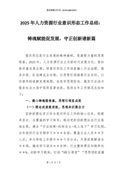【七哥公文】2026年:2025年人力资源行业意识形态工作总结:铸魂赋能促发展,守正创新谱新篇+更多免费公文+VX:QiGeGongWen2024