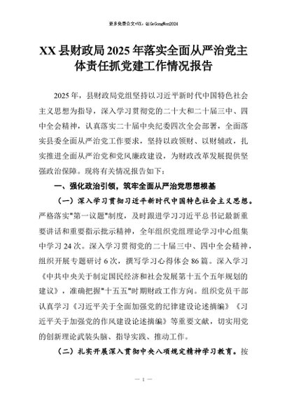 【七哥公文】2026年:XX县财政局2025年落实全面从严治党主体责任抓党建工作情况报告+更多免费公文+VX:QiGeGongWen2024