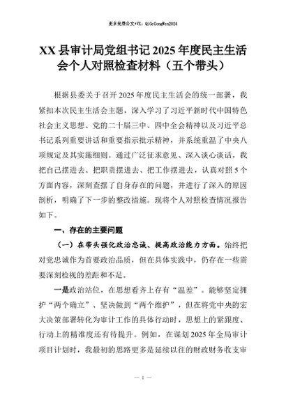 【七哥公文】2026年:XX县审计局党组书记2025年度民主生活会个人对照检查材料(五个带头)_副本+更多免费公文+VX:QiGeGongWen2024