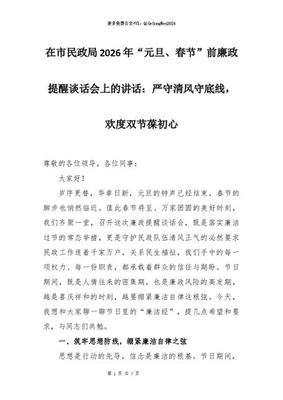 【七哥公文】2026年:在市民政局2026年“元旦、春节”前廉政提醒谈话会上的讲话:严守清风守底线欢度双节葆初心+更多免费公文+VX:QiGeGongWen2024