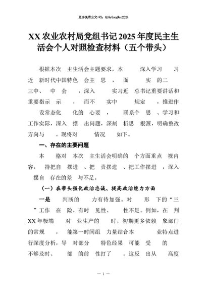 【七哥公文】2026年:XX农业农村局党组书记2025年度民主生活会个人对照检查材料(五个带头)_副本+更多免费公文+VX:QiGeGongWen2024