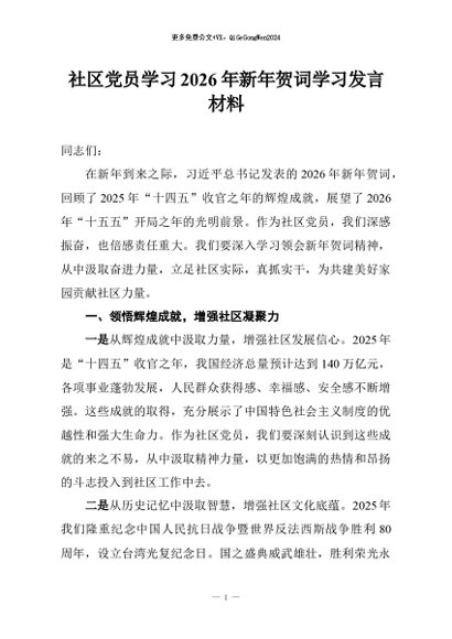 / 【七哥公文】2026年:社区党员学习2026年新年贺词学习发言材料+更多免费公文+VX:QiGeGongWen2024