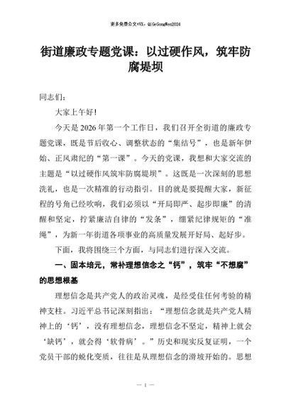 / 【七哥公文】2026年:街道廉政专题党课:以过硬作风,筑牢防腐堤坝+更多免费公文+VX:QiGeGongWen2024