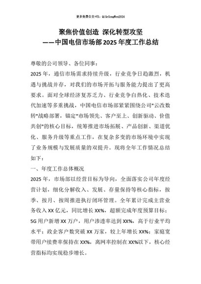 【七哥公文】2026年:聚焦价值创造 深化转型攻坚——中国电信市场部2025年度工作总结+更多免费公文+VX:QiGeGongWen2024