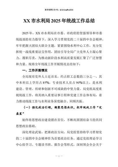 / 【七哥公文】2026年:XX市水利局2025年统战工作总结+更多免费公文+VX:QiGeGongWen2024