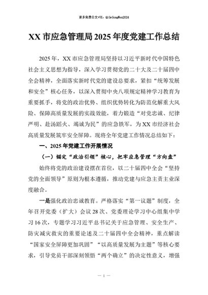 / 【七哥公文】2026年:XX市应急管理局2025年度党建工作总结+更多免费公文+VX:QiGeGongWen2024