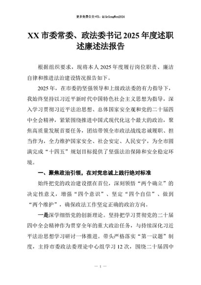 【七哥公文】2026年:XX市委常委、政法委书记2025年度述职述廉述法报告+更多免费公文+VX:QiGeGongWen2024
