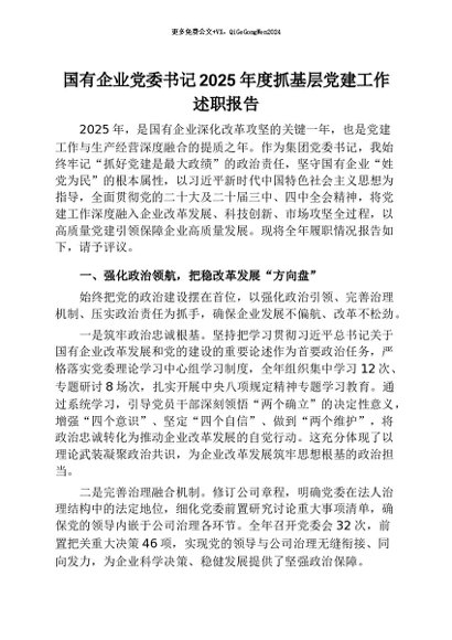 【七哥公文】2026年:国有企业党委书记2025年度抓基层党建工作述职报告+更多免费公文+VX:QiGeGongWen2024