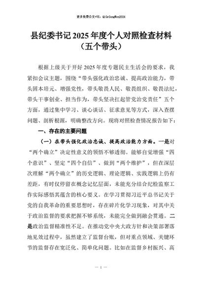 【七哥公文】2026年:县纪委书记2025年度个人对照检查材料(五个带头)+更多免费公文+VX:QiGeGongWen2024