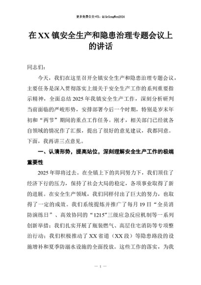 【七哥公文】2026年:在XX镇安全生产和隐患治理专题会议上的讲话+更多免费公文+VX:QiGeGongWen2024