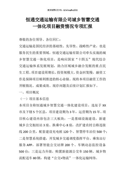 【七哥公文】2026年:恒通交通运输有限公司城乡智慧交通一体化项目融资情况专项汇报+更多免费公文+VX:QiGeGongWen2024