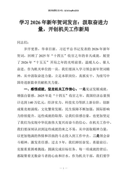 【七哥公文】2026年:学习2026年新年贺词发言:汲取奋进力量,开创机关工作新局+更多免费公文+VX:QiGeGongWen2024