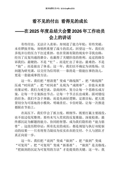【七哥公文】2026年:在2025年度总结大会暨2026年工作动员会上的讲话:看不见的付出 ,看得见的成长+更多免费公文+VX:QiGeGongWen2024