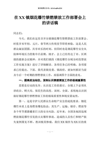 / 【七哥公文】2026年:在XX镇烟花爆竹禁燃禁放工作部署会上的讲话稿+更多免费公文+VX:QiGeGongWen2024