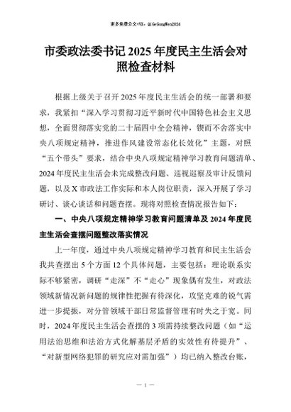 【七哥公文】2026年:市委政法委书记2025年度民主生活会对照检查材料+更多免费公文+VX:QiGeGongWen2024