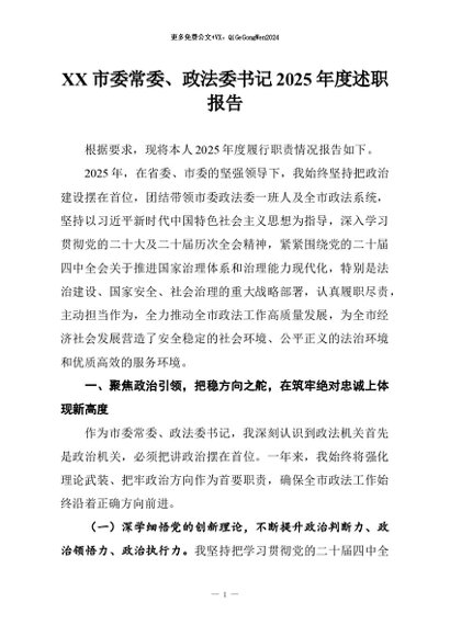 / 【七哥公文】2026年:XX市委常委、政法委书记2025年度述职报告+更多免费公文+VX:QiGeGongWen2024