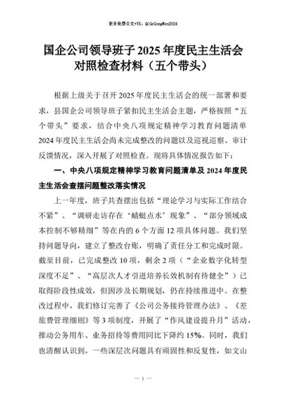 【七哥公文】2026年:国企公司领导班子2025年度民主生活会对照检查材料(五个带头)+更多免费公文+VX:QiGeGongWen2024