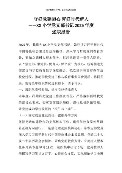 【七哥公文】2026年:守好党建初心 育好时代新人——XX小学党支部书记2025年度述职报告(1)+更多免费公文+VX:QiGeGongWen2024