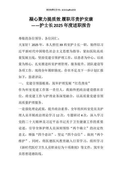 【七哥公文】2026年:凝心聚力提质效 履职尽责护安康——护士长2025年度述职报告+更多免费公文+VX:QiGeGongWen2024