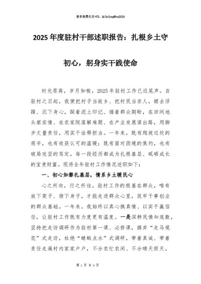 【七哥公文】2026年:2025年度驻村干部述职报告:扎根乡土守初心,躬身实干践使命+更多免费公文+VX:QiGeGongWen2024