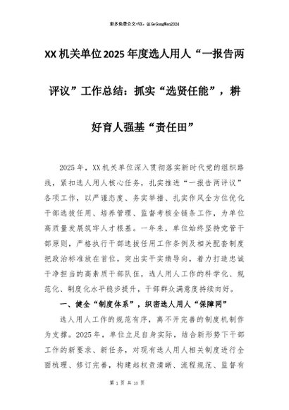 【七哥公文】2026年:XX机关单位2025年度选人用人“一报告两评议”工作总结:抓实“选贤任能”,耕好育人强基“责任田”+更多免费公文+VX:QiGeGongWen2024