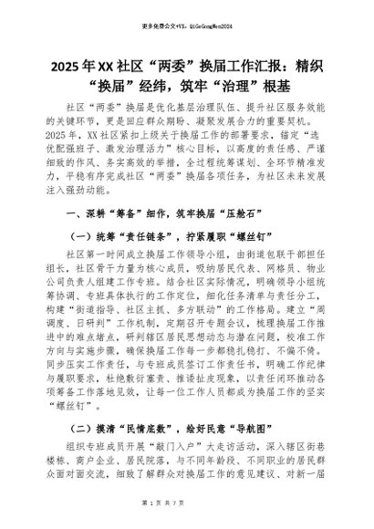 【七哥公文】2026年:2025年XX社区“两委”换届工作汇报:精织“换届”经纬,筑牢“治理”根基+更多免费公文+VX:QiGeGongWen2024