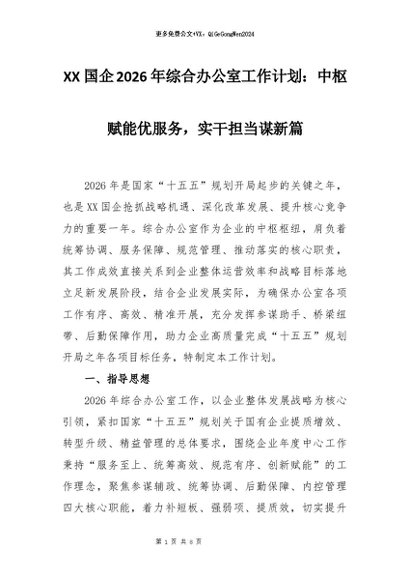 【七哥公文】2026年:XX国企2026年综合办公室工作计划:中枢赋能优服务,实干担当谋新篇+更多免费公文+VX:QiGeGongWen2024