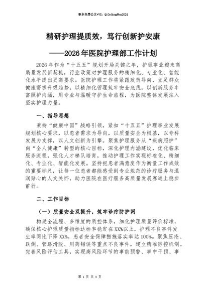 【七哥公文】2026年:2026年医院护理部工作计划:精研护理提质效,笃行创新护安康+更多免费公文+VX:QiGeGongWen2024