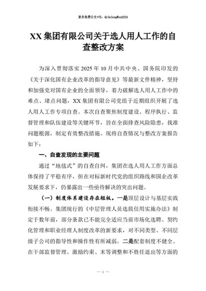 / 【七哥公文】2026年:XX集团有限公司关于选人用人工作的自查整改方案+更多免费公文+VX:QiGeGongWen2024