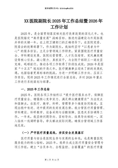 【七哥公文】2026年:XX医院副院长2025年工作总结暨2026年工作计划+更多免费公文+VX:QiGeGongWen2024
