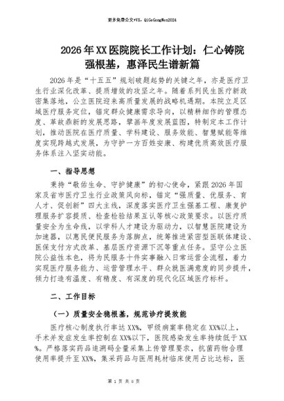 【七哥公文】2026年:2026年XX医院院长工作计划:仁心铸院强根基,惠泽民生谱新篇+更多免费公文+VX:QiGeGongWen2024