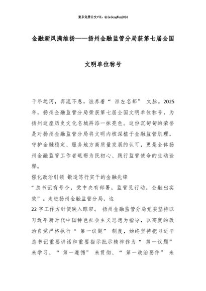 【七哥公文】2026年:金融新风满维扬——扬州金融监管分局获第七届全国文明单位称号_副本+更多免费公文+VX:QiGeGongWen2024