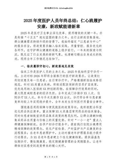 【七哥公文】2026年:2025年度医护人员年终总结:仁心践履护安康,新政赋能谱新章+更多免费公文+VX:QiGeGongWen2024